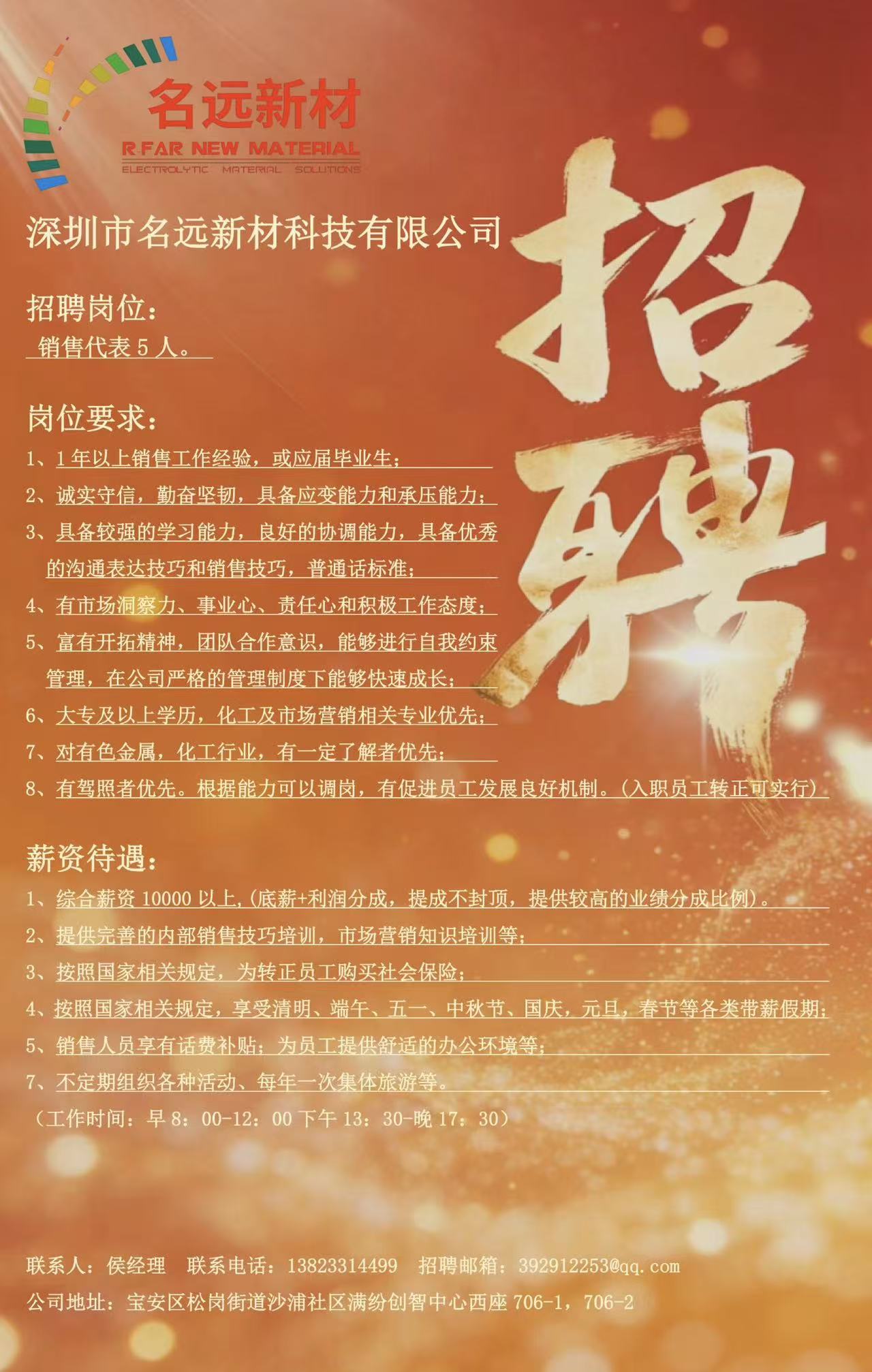 深圳市名远新材科技有限公司前身(深圳市名远投资发展有限公司)主要经营有色金属(镍、铜、锡、银、钴、钯、锆系列),化工原料(镍盐、铜盐、锡盐、钴盐、钾盐、钠盐系列)、环保辅助材料(过...